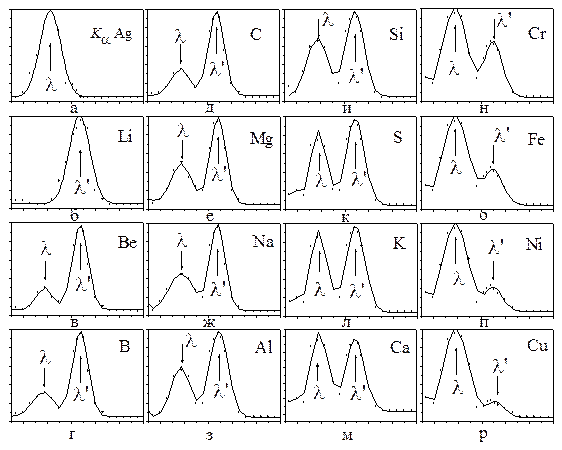На рис. 6.3.3 представлены зависимости интенсивности компонент первичного (l) и рассеянного (l′) излучения от атомного номера рассеивающего вещества. Рис. 6.3.3а характеризует первичное излучение (линия К a серебра). При рассеивании веществами с малым атомным номером (рис. 6.3.3б-6.3.3г) практически все рассеянное излучение имеет смещенную длину волны. По мере увеличения атомного номера все большая часть излучения остается без изменения длины волны (рис. 6.3.3д-6.3.3р).