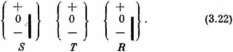 В опыте (3.16) пучок сперва расщеплялся, а потом восстанавливался. Как мы видим, Шалтая-Болтая удалось собрать обратно. Информация о первоначальном состоянии (+ S) сохранилась — все выглядит так, как если бы прибора Т вовсе не было. И это будет верно, что бы ни поставили за «до отказа раскрытым» прибором Т. Можно поставить за ним фильтр R — под каким-нибудь необычным углом — или что-угодно. Ответ будет всегда одинаков, как будто атомы шли в S ' прямо из первого фильтра S. Итак, мы пришли к важному принципу: фильтр Т или любой другой с открытыми до отказа заслонками не приводит ни к каким изменениям. Надо только упомянуть одно добавочное условие. Открытый фильтр должен не только пропускать все три пучка, но и не вызывать в них неодинаковых возмущений. Например, в нем не должно быть сильного электрического поля близ одного из пучков, которого не было бы возле других. Причина заключается вот в чем: хотя это добавочное возмущение может и не помешать всем атомам пройти сквозь фильтр, оно может привести к изменению фаз некоторых амплитуд. Тогда интерференция стала бы не такой, как была, и амплитуды (3.18) и (3.19) стали бы другими. Мы всегда будем предполагать, что таких добавочных возмущений нет. Перепишем (3.18) и (3.19) в улучшенных обозначениях. Пусть i обозначает любое из трех состояний (+ Т), (0 Т)и (- Т); тогда уравнения можно написать так: