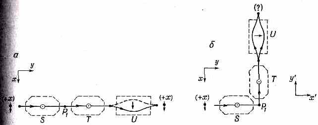 Но мы не вправе утверждать, что фазы амплитуд, относящихся к прибору Т, не могут в двух различных ориентациях а и б (фиг. 4.4) различаться. Пары приборов, показанных на фиг. 4.4, на самом деле отличаются друг от друга, в чем можно убедиться следующим образом. Предположим, что мы перед прибором S поставили другой, создающий чистое (+ x)-состояние. (Ось х направлена на рисунке вниз.) Эти частицы расщеплялись бы в S на пучки (+ z) и (- z), но на выходе S (в точке Р 1 ) оба пучка снова соединялись бы и восстанавливали состояние (+ х). Затем то же самое происходило бы в Т. Если бы за Т поставить третий прибор U, ось которого направлена по (+ х). как показано на фиг. 4.5, а, то все частицы пошли бы в пучок (+) прибора U.