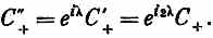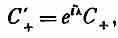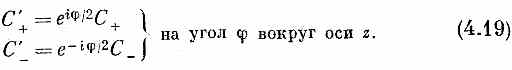 Для угла j и для всех поворотов, которые встретятся нам в будущем, мы условимся считать, что положительным поворотом будет поворот правого винта, который ввинчивается в положительном направлении z. Теперь остается узнать, каким должно быть m. Попробуем сперва следующее рассуждение: пусть Т повернулся на 360°; ясно, что тогда он опять очутится под нулем градусов, и мы должны будем иметь С'+ = С+ и С'-= С-, или, что то же самое, eim2p= 1. Мы получаем m =1. Это рассуждение не годится! Чтобы убедиться в этом, допустим, что Т повернут на 180°. Если бы т было равно единице, мы получили бы