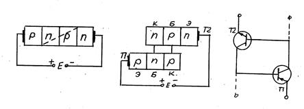 Переходы П1 и П3 называются эмиттерными, они включены в прямом направлении. Средний П2 – коллекторный переход заперт обратным напряжением источника Е. Внутренние области называются базами. Для анализа работы тиристора четырехслойную структуру целесообразно представить в виде двух транзисторов: n–р–n и р–n–р – типов. Коллекторный ток VT1 является одновременно базовым током VT2, а коллекторный ток транзистора VT2 базовым током VT1. IБ2=Iк1 и IБ1=Iк2 Стоит подать питающее напряжение на электроды, как любое возрастание тока одного транзистора приводит к увеличении тока другого.