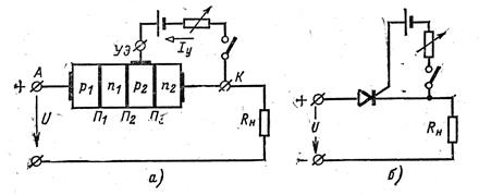 При определенном значении тока управления, называемых током спрямления Iyc (рис.1.19) тиристор работает как неуправляемый вентиль, т.е. открыт при любом положительном напряжении на аноде. Управляющий электрод после открытия тиристора перестает оказывать влияния на его работу. В цепь управляющего электрода подают кратковременный импульс прямоугольной формы длительностью примерно 10 мкс. Схема включения тиристора показана на рис. 1.20.б. При подаче обратного напряжения тиристор закрывается обратно включенными переходами П1 и П3, независимо от управляющего тока.