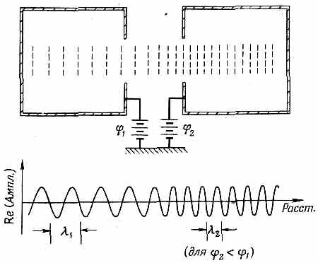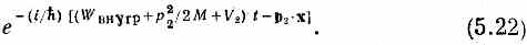 Здесь по обе стороны стоят просто классические полные энергии, так что (5.23) есть утверждение о сохранении энергии. Иными словами, классическое утверждение о сохранении энергии вполне равноценно квантовомеханическому утверждению о том, что частоты у частицы всюду одинаковы, если условия во времени не меняются. Все это согласуется с представлением о том, что h w =E. В том частном случае, когда V1=0, a V2 отрицательно (5.23) означает, что p 2 больше р 1,т. е. в области 2 волны короче. Поверхности равной фазы показаны на фиг. 5.3 пунктиром. Там еще вычерчен график вещественной части амплитуды, из которого тоже видно, как уменьшается длин волны при переходе от области 1 в область 2. Групповая скорость волн, равная р/М, тоже возрастает так, как и следовало ожидать из классического сохранения энергии, потому что оно просто совпадает с (5.23). Существует интересный частный случай, когда V2 становится столь большим, что V 2- V 1 уже превышает p 21 /2M. Тогда p 22, даваемое формулой