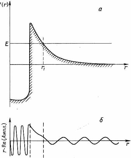 Эффект называется квантовомеханическим «проникновением сквозь барьер». Проникновение квантовомеханической амплитуды сквозь барьер дает объяснение (или описание) a-распада ядра урана. Кривая зависимости потенциальной энергии a-частицы от расстояния от центра показана на фиг. 5.6, а.