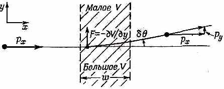 Если частица движется в направлении х и вступает в область, где имеется потенциал, изменяющийся вдоль y, то частица получит поперечное ускорение от силы F=-дV/дy. Если сила присутствует только в ограниченной области шириной w, то она будет действовать только в течение времени w/v. Частица получит поперечный импульс py= Fw/v Тогда угол отклонения dq будет равен