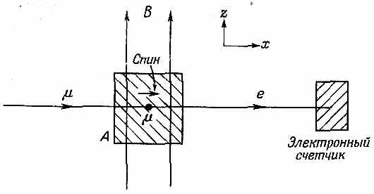 При этом распаде оказывается, что (по крайней мере при высоких энергиях) электроны испускаются преимущественно в направлении, противоположном направлению спина мюона. Допустим затем, что имеется экспериментальное устройство (фиг. 5.9): поляризованные мюоны входят слева и в блоке вещества А останавливаются, а чуть позже распадаются.