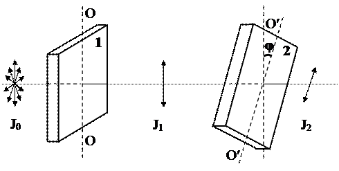 На пути естественного света помещены две пластинки турмалина. После прохождения пластинки 1 свет полностью поляризован. Если J1 и J2 - интенсивности света, прошедшего пластинки 1 и 2 соответственно, и угол между направлениями ОО и О¢О¢ φ = 00, то J1 и J2 связаны соотношением … *