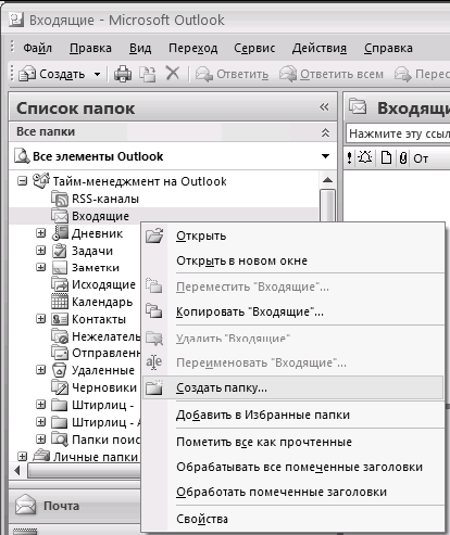 2. В открывшемся списке кликните правой кнопкой мыши на папке «Входящие» и выберите в контекстном меню пункт «Создать папку».