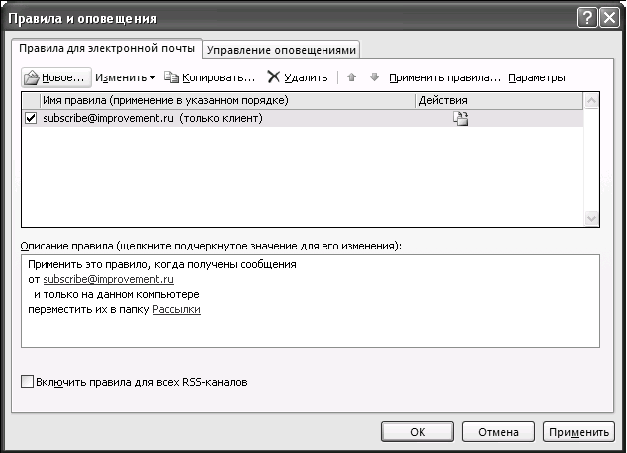 8. Теперь перед вами окно «Правила и оповещения». На вкладке «Правила для электронной почты» появилось только что созданное нами правило «subscribe@improvement.ru».