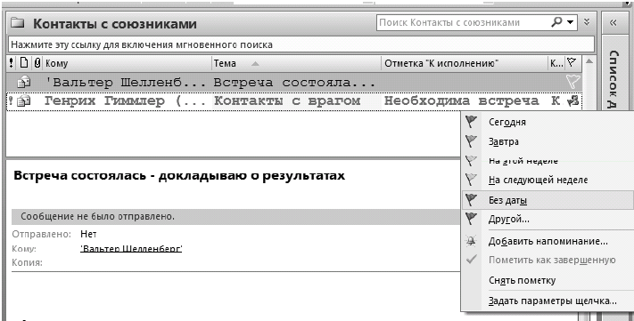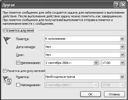 Поставив на письме один из флагов к исполнению (их несколько, разных цветов), вы фактически превращаете письмо в задачу. С этого момента в Outlook 2007 оно видно в панели задач при календаре, его так же, как и любую задачу, можно помещать в категории «1-День» и «1-Неделя» и контекстные категории («Шеф», «Клиенты», «Поставщики» и т.д.). Письмо становится полноправным элементом вашей системы управления задачами. (В Outlook 2003 письмо, помеченное «К исполнению», не появляется в задачах. Но в списке папок есть специальная папка «К исполнению», в которой все они видны.) Бывает, что на письмо нужно отреагировать в какой-то точно определенный момент. Например, в письме содержится просьба «Позвоните мне, пожалуйста, во второй половине дня в четверг». В таком случае стоит установить время оповещения. В нужный момент, например в 15.00 в четверг, прозвучит сигнал и в окне оповещений появится это письмо. Отметить письмо «к исполнению» и поставить на него оповещение можно следующим образом.