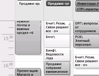В «Календаре» я веду не только планирование, но и хронометраж. «Факт» получается из плана с помощью простого изменения границ встречи либо добавления того, что не было запланировано, но произошло. Выглядит это примерно так (см. рисунок ниже): зеленым и синим – бюджетируе-мые и жесткие задачи и встречи, первая категория расходов времени (плотная, основная работа); нераскрашенным – вторая категория: вроде бы работа, но не создающая явного, заметного результата (например, Бпчт– разгребание электронной почты). Пометки типа ОРГ– это обозначения ключевых областей, они ставятся в тех задачах, которые являются скорее функциональными, чем проектными (ОРГ– организация, КДР– кадры, работа с сотрудниками, РСК– раскрутка, то есть PR, реклама и прочее). Пробелы – это техническое время (например, дорога, пауза в работе) Вверху, над хронометражными записями, – мемуарник.