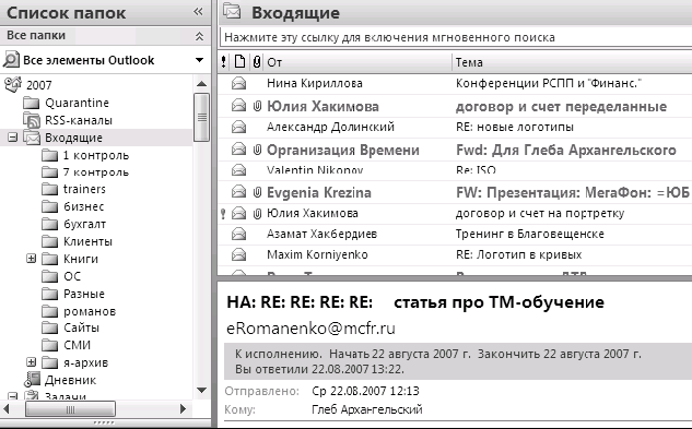 Автоматических фильтров для почты я не использую, спам отсеивает секретарь (пересылая с info@improvement.ru на мой личный ящик только те письма, которые действительно адресованы мне). Вся работа осуществляется вручную следующим образом. Почту я стараюсь скачивать не чаще 3-4 раз в день (внеочередной позыв скачать почту – верный признак нежелания делать что-то по-настоящему важное) и тратить в день на ее разбор от 30 до 60 минут в общей сложности, лучше – меньше. Входящие быстро просматриваются, на что можно ответить сразу и быстро – получает свой ответ, и письмо вручную скидывается в одну из архивных папок (структуру папок можно увидеть на скриншоте ниже).