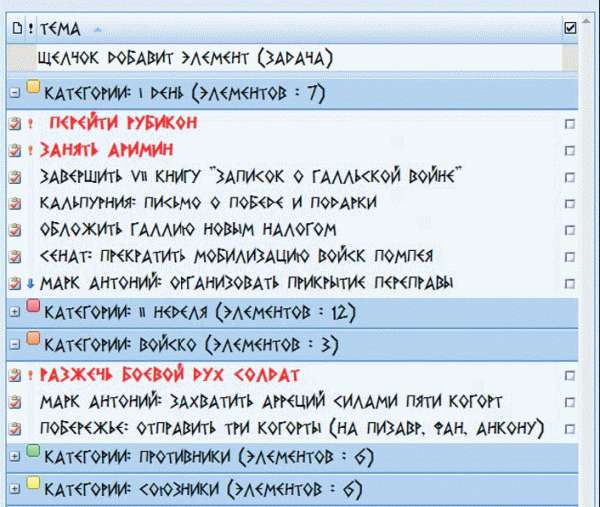 Задачи сгруппированы по категориям: день, неделя, войско, противники и т.д. Приоритетные задачи выделены красным и вынесены в начало списка. Задачи «на контроле» отмечены синей стрелкой и перенесены в конец списка.