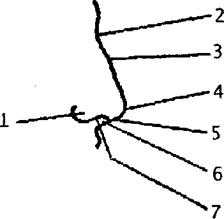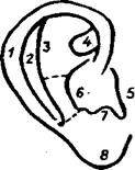1)Завиток. 2)Противозавиток. 3)Полость ушной раковины. 4)Треугольная ямка. 5)Козелок. 6)Противокозелок. 7)Мочка.