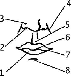 1)Нижняя губа. 2)Ноздря. 3)Нос. 4)Носогубная борозда. 5)«Фильтр». 6)Складка губ. 7)Угол рта. 8)Подбородочная борозда.