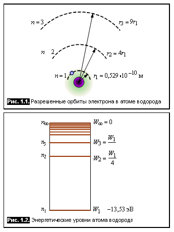 Каждой орбите соответствует строго определенная энергия электрона, или энергетический уровень. Энергетические уровни отделены друг от друга запрещенными интервалами (рис. 1.2). Согласно принципу Паули на одном энергетическом уровне не может находиться более двух электронов, причем спины этих электронов должны быть противоположны. В невозбужденном состоянии электроны в атоме находятся на ближайших к ядру орбитах и в таком состоянии находятся до тех пор, пока какое-либо внешнее воздействие не сообщит атому добавочную энергию. При поглощении энергии атомом какой-либо электрон может перейти на один из более высоких свободных уровней, либо вовсе может покинуть атом, став свободным носителем электрического заряда, а атом при этом превращается из нейтрального в положительно заряженный ион.