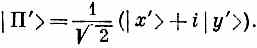 Доказательство: сложите и вычтите два уравнения в (9.34). От одного базиса к другому очень легко переходить. Впрочем, одно замечание надо бы сделать. Если фотон поляризован по правому кругу, он не имеет никакого касательства к осям х и у. Если бы мы взглянули на него из системы координат, повернутой вокруг направления полета на какой-то угол, то свет по-прежнему был бы поляризован по кругу; то же с левой поляризацией. Право- и левополяризованный по кругу свет при любом таком повороте одинаков; определение не зависит от выбора направления х (если не считать того, что направление фотона задано). Великолепно, не так ли? Для определения не нужны никакие оси. Куда лучше, чем х и у!Но, с другой стороны, не чудо ли, что, складывая левое и правое, вы в состоянии узнать, где было направление x? Если «правое» и «левое» никак не зависят от х, как же получается, что мы можем сложить их и вновь получить x? На этот вопрос можно частью ответить, расписав состояние |П'>, представляющее фотон, правополяризованный в системе координат х', у'. В этой системе мы бы написали