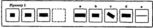 В каждом задании выберите, пожалуйста, справа тот квадратик с рисунком, который наиболее подходит на место пустого квадратика слева, чтобы дополнить общий рисунок. Вы должны вычеркнуть букву, соответствующую этой фигуре, на вашем бланке ответов. Пример 1.