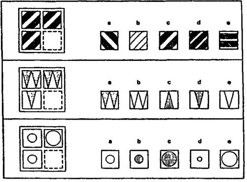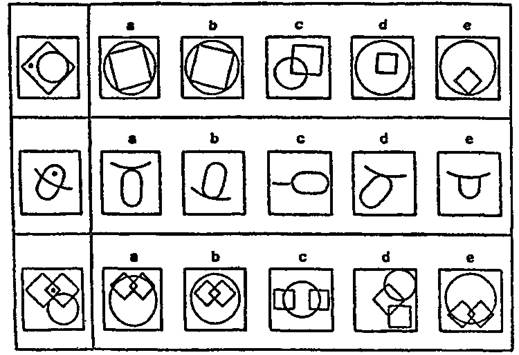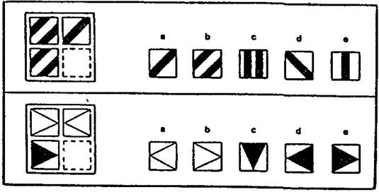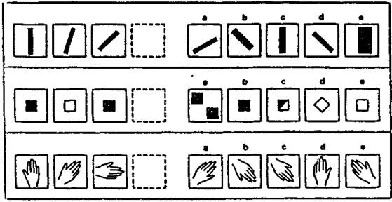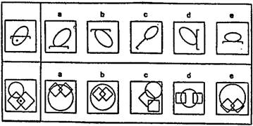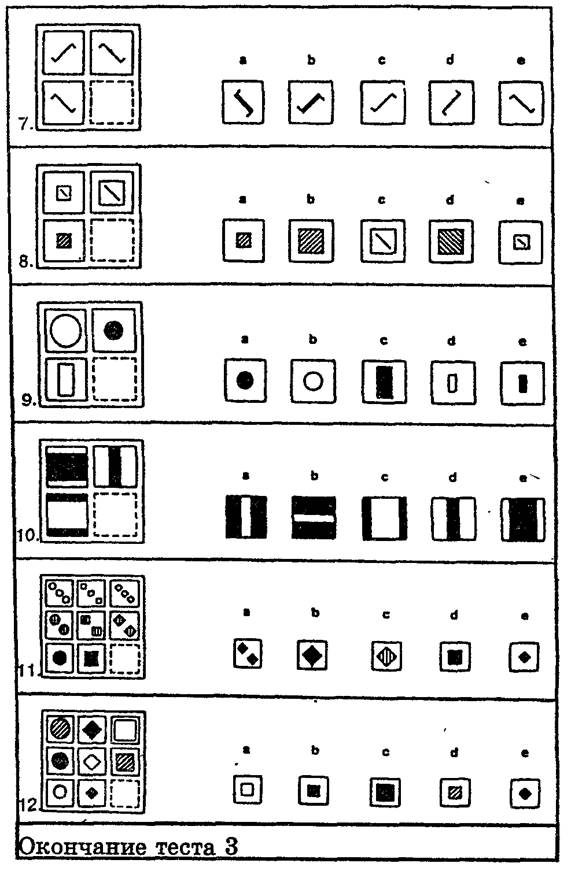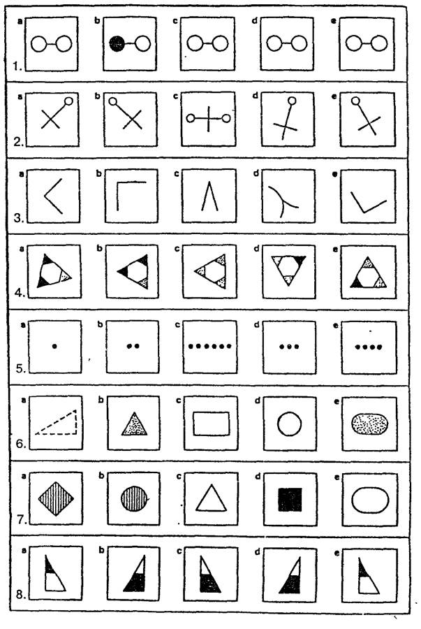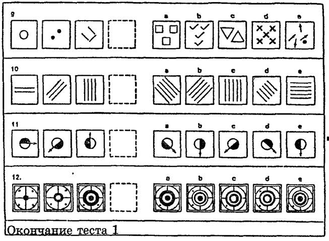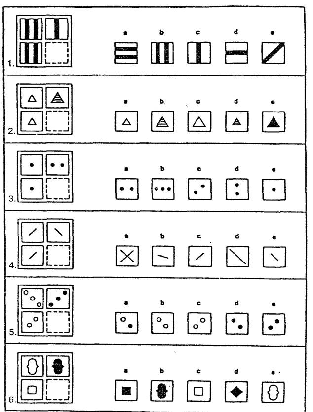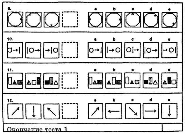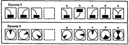 ОБРАБОТКА И ИНТЕРПРЕТАЦИЯ РЕЗУЛЬТАТОВ Результаты тестирования сверяются с ключом (прил. II). Затем подсчитывается количество правильных ответов по каждому тесту и их общая сумма в первой и второй части методики. Суммы баллов обеих частей также складываются, полученный результат является сырым баллом, который переводится в стандартную оценку IQ при помощи таблицы возрастных норм (прил. III). Считается, что средняя норма IQ находится в пределах от 90 до 110 баллов. Показатели выше этого уровня могут свидетельствовать об одаренности испытуемого, ниже него – об отставании в умственном развитии. Инструкция: Этот тест состоит из двух больших частей, построенных аналогичным образом. Каждая часть содержит графические задачи, которые объединяются в четыре группы (отдельные тесты). В каждой группе заданий (в каждом отдельном тесте) задачи расположены в порядке возрастания их сложности. Возможно, что никому не удастся правильно решить все задачи. Но старайтесь всегда решить как можно больше. Если Вы не уверены в правильности своего решения, то лучше выбрать то решение, которое покажется Вам более вероятным, чем вообще не решить. Все задачи имеют только одно правильное решение! На решение одной группы заданий отводится ограниченное время. Если Вы закончили раньше отведенного времени, то не мешайте, пожалуйста, другим, а перепроверьте свои решения еще раз. Все ответы необходимо заносить на специальный бланк. Нельзя ничего писать на этом тесте! Ни в коем случае нельзя переворачивать страницу прежде, чем Вас попросят об этом! ЧАСТЬ I Тест 1 В каждом ряду Вам необходимо выбрать из пяти фигур справа ту, которая наиболее подходит к трем фигурам слева. Вы должны вычеркнуть букву, соответствующую этой фигуре, на вашем бланке ответов. Примеры.