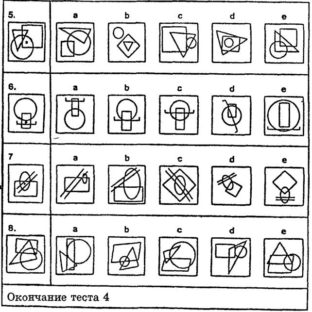 В первом примере с – правильное решение, потому что только здесь можно поместить точку в квадрат таким образом, чтобы она оказалась вне круга. Потому на Вашем бланке ответов в четвертом тесте уже вычеркнута буква с. В следующих примерах и заданиях Вы не должны вписывать точку в соответствующее место, надо лишь вычеркивать соответствующую букву в Вашем бланке ответов. Тест 4