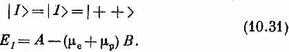 Теперь он состоит из трех частей. Первый член А (sе•sр) представляет магнитное взаимодействие между электроном и протоном; оно такое же, как если бы магнитного поля не было. Влияние внешнего магнитного поля проявляется в остальных двух членах. Второй член (-m е s е • В) — это та энергия, которой электрон обладал бы в магнитном поле, если бы он там был один. Точно так же последний член (-mр s р• В) был бы энергией протона-одиночки. Согласно классической физике, энергия их обоих вместе была бы суммой их энергий; по квантовой механике это тоже правильно. Возникающая из-за наличия магнитного поля энергия взаимодействия равна просто сумме энергий взаимодействия электрона с магнитным полем и протона с тем же полем, выраженных через операторы сигма. В квантовой механике эти члены в действительности не являются энергиями, но обращение к классическим формулам для энергии помогает запоминать правила написания гамильтониана. Как бы. то ни было, (10.27) — это правильный гамильтониан. Теперь нужно вернуться к началу и решать всю задачу сызнова. Но большая часть работы уже сделана, надо только добавить эффекты, вызываемые новыми членами. Примем, что магнитное поле В постоянно и направлено по z. Тогда к нашему старому гамильтонову оператору Н^ надо добавить два новых куска; обозначим их Н^':