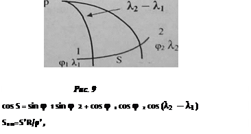 Выбрать на общегеографической карте две точки, лежащие на разных меридианах и параллелях. Изобразить их на схематическом чертеже. В построении получается сферический треугольник. Решить его по формулам сферической тригонометрии где S - длина дуги в градусной мере. Sкм, - длина дуги в линейной мере, R - радиус кривизны эллипсоида Красовского для средней широты (км), (приложение5[5]