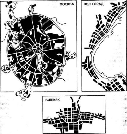 Рис. 77. Графические образы городов ; Распознавание графических образов — это отнесение конкретных конфигураций к определенному классу объектов. Опытный географ не спутает на карте гидрографическую сеть с дорогами, горизонтали с границами. Наиболее перспективными в распознавании образов являются методы, основанные на определении структурных элементов графического рисунка: узлов, скоплений линий, их плотности, связи и др. Структурный анализ, узнавание графических образов не только в науках о Земле, но и в других, связанных с изображениями объектов, развивается сегодня в рамках научного направления под названием «машинное зрение». Карта — отображение конкретного геопространства. Но, конечно, это не образ, полученный при непосредственном его созерца- нии, а лишь отображение реальности, мысленно переработанное. Образный язык карты древний, старше форм письменности. Картографические образы (КО) создаются всеми графическими средствами: формой знаков, величиной, цветом, оттенками, внутренней структурой. На карте возникают комбинации, сочетания знаков из разных графических систем (изолинии, значки, фон и т. д.), которые образуют множество картографических образов, подобно тому как комбинация из семи нот создает мелодию. Размещение условных знаков, совмещение их, создание единой композиции позволяет получать пересечение образов и создавать сложные карты, на которых показаны сложные комплексные явления, например ландшафтно-экологические карты. Перекрытие, наложение разных систем знаков — распространенный прием формирования КО (цвет, штрих, знак). Это невозможно сделать при описании явления, так как при описании неизбежна последовательность в изложении материала. Карта позволяет увидеть все события одномоментно. Использование карт в качестве средства познания можно трактовать как анализ картографического образа. Все образы могут быть оценены картометрически, в количественных показателях. Можно сказать, что это подтверждает объективность их существования, дает возможность их математического моделирования, автоматического распознавания. В задачах распознавания образов необходимо определить некоторую обобщенную характеристику, объединяющую совокупность объектов в данный класс (образ). Пользователь карты имеет дело со множеством комбинаций, но легко ориентируется, выбирая.нужные образы. В этом случае читателя карты можно сравнить с шахматистом, перебирающим комбинации. И тот и другой «сортирует» варианты. Приведем пример, подтверждающий это утверждение. На рисунке 78 легко увидеть структурно-тектонические особенности участков по конфигурации гидросети. Конфигурация гидросети — индикатор структурно-тектонических особенностей.