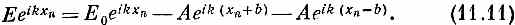 Перед нами бесконечное число уравнений для бесконечного количества неизвестных аn! Ситуация тяжелая! Но мы знаем, что надо только взять детерминант... нет, погодите! Детерминанты хороши, когда уравнений два, три или четыре. Но здесь их очень много, даже бесконечно много, и вряд ли от детерминантов будет толк. Нет, лучше попробовать решать эти уравнения прямо. Во-первых, пронумеруем положения атомов; будем считать, что n- йатом находится в хn, а (n+ 1)-й— в хn+ 1. Если расстояние между атомами равно b (как на фиг. 11.1), то хn+ 1 =хn+b. Взяв начало координат в атоме номер нуль, можно даже получить хn = nb. Уравнение (11.5) можно тогда переписать в виде