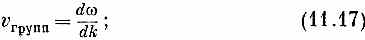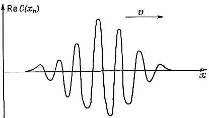 все это в равной мере относится и к нашему случаю. Состояние электрона, имеющее вид «скопления», т. е. состояние, для которого Сn меняется в пространстве так, как у волнового пакета на фиг. 11.5, будет двигаться вдоль нашего одномерного «кристалла» с быстротой v, рапной dw/dk, где w= E/h.