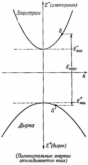 А чтобы создать пару в состояниях S и S', потребуется просто энергия Е- + Е+. Образование пар — это, как мы увидим позже, очень частый процесс, и многие люди предпочитают помещать фиг. 12.2 и 12.3 на один чертеж, причем энергию дырок откладывают вниз, хотя, конечно, эта энергия положительна. На фиг. 12.4 мы объединили эти два графика.