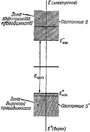 Это некоторая энергия, превышающая Е- мин. Энергия, необходимая для того, чтобы «создать» дырку в каком-то состоянии S ',— это энергия Е+ (фиг. 12.3), которая на какую-то долю выше, чем Е (=Е+ мин ).