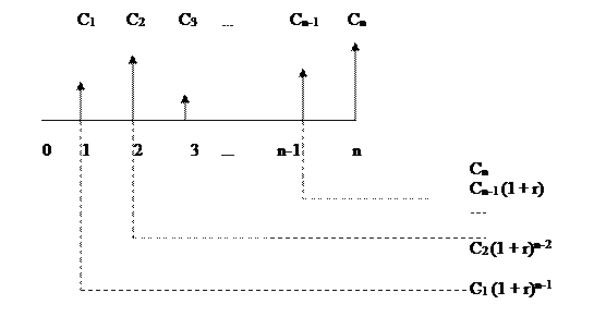 Прямая задачапредполагает оценку с позиции будущего, т.е. на конец периода п, когда реализуется схема наращения, которую можно представить следующим образом (рис. 7.6). Таким образом, на первое денежное поступление С1 начисляются сложные проценты за (n - 1) период, и оно в конце n-гопериода станет равным C1(l + r)n-1. На второе денежное поступление С2 начисляются сложные проценты за (n-2)периода, и оно станет равным С2(1 + r)n-2и т.д. На предпоследнее денежное поступление Сn-1 проценты начисляются за один период, и оно будет в конце n-го периода равно Сn-1(1 + r).Естественно, на Сn проценты не начисляются.