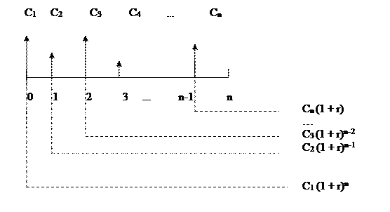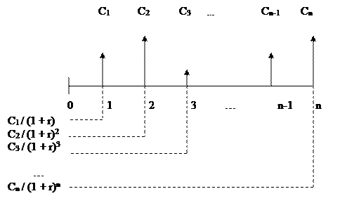 Следовательно, наращенный денежный поток для исходного потока постнумерандо имеет вид: C1 (1 + r)n-1, C2 (1 + r)n-2, …, Сn-1 (1 + r), Сn , и будущая стоимость FVpstисходного денежного потока (аннуитета) постнумерандо может быть оценена как сумма наращенных поступлений, т.е. получаем формулу: FVpst = Обратная задача подразумевает оценку с позиции текущего момента, т.е. на конец периода 0. В этом случае реализуется схема дисконтирования, а расчеты необходимо вести по приведенному потоку. Элементы приведенного денежного потока уже можно суммировать; их сумма характеризует приведенную, или текущую, стоимость денежного потока, которую при необходимости можно сравнивать с величиной первоначальной инвестиции. Схема дисконтирования для исходного потока постнумерандо имеет следующий вид (рис. 3).