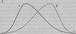 Рис. 4.1. Кривые распределения признака с меньшим диапазоном вариативности признака (1) и большим диапазоном распределения признака (2); х - значения признака; Именно такое соотношение может наблюдаться в распределении фенотипических признаков у мужчин (кривая 2) и женщин (кривая 1). Фенотипическая дисперсия мужского пола должна быть больше, чем женского (Геодакян В.А., 1974; 1993). Мужчины - это авангардная часть популяции, ответственная за поиск новых форм приспособления, поэтому у них чаще встречаются редкие крайние значения различных фенотипических признаков. Эти отклонения, по мнению В.А. Геодакяна, носят "футуристический" характер, это "пробы", включающие как будущие возможные пути эволюции, так и ошибки (Геодакян В.А., 1974, с. 381). В то же время женская часть популяции ответственна за сохранение уже накопленных изменений, поэтому у них чаще встречаются средние значения фенотипических признаков. Анализ реально получаемых в исследованиях распределений может позволить нам подтвердить или опровергнуть данные теоретические предположения. На Рис. 4.2 представлены два распределения, различающиеся по знаку асимметрии: распределение 1 характеризуется положительной асимметрией (левосторонней), а распределение 2 — отрицательной (правосторонней).