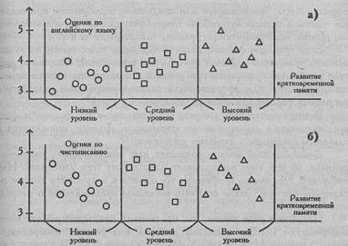 Рис. 7.1. Рассеивание индивидуальных средних оценок по английскому языку (а) и чистописанию (б) у учеников с низким, средним и высоким уровнями развития кратковременной памяти