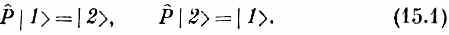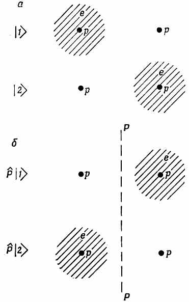 Фиг. 15.1. Если состояния |1> и |2> отразить в плоскости Р—Р, они перейдут соответственно в состояния |2> и |1>. И вот, поскольку оба ядра в точности одинаковы, в этой физической системе имеется определенная симметрия. Иначе сказать, если бы нам пришлось отразить систему в плоскости, поставленной посредине между двумя протонами (имеется в виду, если бы все находящееся с одной стороны плоскости симметрично перешло на другую сторону), то возникла бы картина, представленная на фиг. 15.1, б. А коль скоро протоны тождественны, операция отражения переводит | 1 >в | 2 >, а | 2> в | 1 >. Обозначим эту операцию отражения Р^ и напишем
