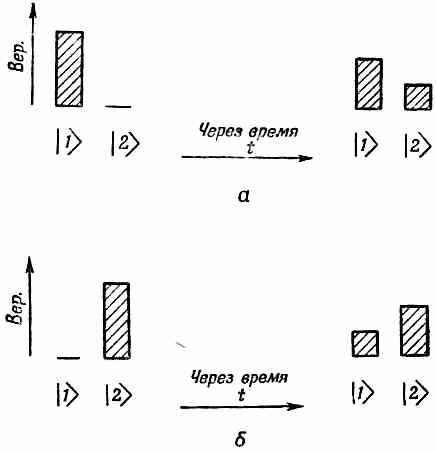 Фиг. 15.2. Если в симметричной системе чистое состояние |1 > развивается во времени так, как показано в части (а), то чистое состояние |2 > будет во времени развиваться так, как показано в части (б).