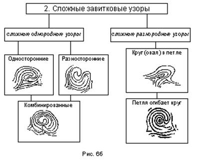 Папиллярные узоры. Кроме следов ладоней есть папиллярные узоры: они обладают следующими свойствами: 1 – Индивидуальность – это неповторимость папиллярных узоров. Т.е. среди всех людей нет кого-то с одинаковыми пальцевыми узорами. Вероятность совпадения астрономически мала (1:10010). Комбинации папиллярных линий неповторимы даже на пальцах одной руки. 2 – Относительная устойчивость (неизменяемость) – обусловлена тем, что они остаются неизменными на протяжении всей жизни человека, начиная с внутриутробного периода и даже на протяжении некоторого времени после смерти. 3 – Удобство для классификации, так как множество признаков (в т.ч. общих). 4 – Прилипаемость (адгезивность) потожирового вещества. Она возникает за счет физиологического строения кожи рук. Кожа состоит из наружного слоя – эпидермиса и дермы (собственно кожи). В верхней части дермы – есть сосочки, между которыми проходят протоки потовых желез, которые заканчиваются порами. Благодаря таком у строению происходит выделение потожирового вещества. Потожировое вещество переходит на предмет, копируя папиллярные узоры и другие детали микрорельефа. Пот состоит из: хлора, натрия, калия, меди, аминокислоты, липидов. Пот выделяется через поры. Жировое вещество состоит из: жирных кислот, глицерина, холестерина вырабатывается сальными железами, которых нет в ладони, но попадает оно с других частей тела, и смешивается с потом. Именно жировое вещество обеспечивает прилипаемость к нему различных порошков, смешиваясь с потом. 5 – Восстанавливаемость – состоит в способности эпидермиса, приобретать прежний вид после различных поверхностных повреждений (ожогов, например). В случае повреждений дермы (более глубокого слоя) образуются шрамы, следы, которые еще более индивидуализируют след. 6 – Сохраняемость пальцевых следов. На пористых материалах они сохраняются относительно недолго – 1-2 дня. Потожировое вещество впитывается в такие материалы и расплывается в размытое, не имеющее деталей пятно. Потому такие предметы должны быть исследованы в первую очередь. На стекле, кафеле, фарфоре, при температуре 20-25 градусов следы могут оставаться 90-180 дней. Дождь не может смыть следы, они также не сгорают – все это обеспечивается за счет особого состава потожирового вещества. За счет вышеуказанных свойств можно идентифицировать человека: - По следам ногтевых фаланг пальцев: узорам, деталям, порам, краям линий (дактилоскопическая идентификация, эджескопическая идентификация, пороскопическая идентификация). - По общей совокупности флексорных и белых линий, микродеталям по краям флексорных линий (пальмоскопическая идентификация). - По биологическому исследованию потожирового вещества. За счет этого исследования можно определить группу крови лица, можно судить о половой принадлежности, о некоторых заболеваниях, принимаемых лекарствах, других особенностях человека. - ДНК – Анализ (генотипоскопическая экспертиза) позволяет по потожировому веществу идентифицировать конкретного человека. Классификация папиллярных узоров. Существует три основных типа узоров: дуговые, петлевые, завитковые.
