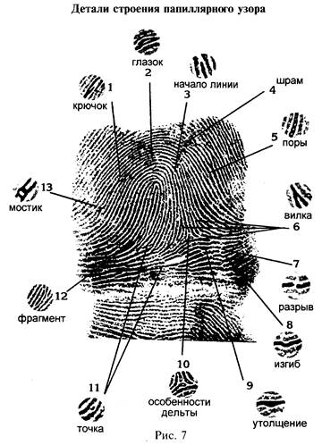 Помимо узоров существуют частные признаки папиллярных линий. Ниже представлена наглядная картина данных признаков.