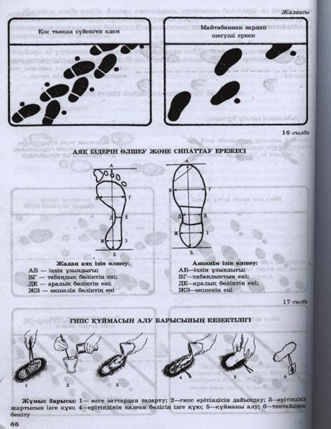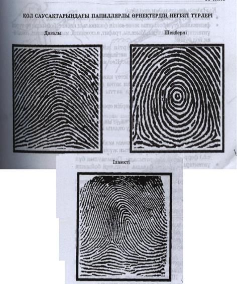кейін де ең ұзақ уақытқа сақталады. Адам су астында жатқанда да оның қаншалықты жатқандығын осы алақандағы попилярлы сызықтардан білуге болады. Попилярлы сызықтармен бірге алақанның бет терісінің басқа да рефлекс-бедер белгілері көрініс алады. Криминалистикада көп көңіл рефлекске бөлінеді. Папилярлы өрнектің құрылымын зерттеумен дактилоскопия айналысады. Попилярлы өрнектің үш түрі бар: 1. доға тәріздес – саусақ өрнегінің бір бетінен екінші бетіне иіліп доға тәрізді түсуі 2. ілмекті өрнек – саусақ ортасында ілмек тәріздес бір жақтан екінші жаққа сызылып орныққан өрнек. 3. ораулы өрнек – спираль тәрізді оралып орналасады. Аяқ іздері әртүрлі қылмыстарды тергегенде оқиға болған жерден табылуы мүмкін. Аяқ іздерін қарау мен жалғасушы сараптамалық зерттеу қылмыскерді табу мен іздестіру үшін қолданылатын маңызды мән-жайларды анықтайды. Аяқ іздері арқылы оны қалдырған адам туралы (оның бойын және жүрісіндегі ерекше белгілері), аяқ киім белгілері туралы, әрекет жағдайы туралы (қозғалыс жылдамдығы мен бағыты) анықтауға, адамды және оның аяқ киімін салыстыру үшін қолдануға болады. Іздер жалаң аяқ, аяқ киім, шұлық киген аяқ киім іздері бойынша ерекшеленеді. Жалаң аяқ іздеріне табан өлшемі, әрбір саусақ ұзындықтары мен ендері, табанның жалпы қалыбы, папилярлы өрнектердің жалпы құрылысы, иілген қабаттар көрініс алады. Шұлық киілген аяқ іздерінің жалпы белгілері болып мыналар табылады: шұлық өлшемі, жіптердің тоқылу түрі мен схемасы, өкше жақтарының тігістері. Аяқ іздері арқылы шамамен адам бойын, оның аяқ киім өлшемін анықтауға болады. Антропометриялық зерттеулер ер адамның табан өлшемін 15,8 % және әйел адам бойын 15,5% -ға теңесетінін анықтаған.