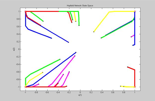 T = [+1 -1; -1 +1; +1 +1; -1 -1]; T=T'; plot(T(1,:),T(2,:),'rh','MarkerSize',13), hold on; axis([-1.1 1.1 -1.1 1.1]); title('Hopfield Network State Space'); xlabel('a(1)'); ylabel('a(2)'); net = newhop(T); [Y,Pf,Af] = sim(net,4,[],T); Y color = 'rgbmy'; for i=1:25 a = {rands(2,1)}; [y,Pf,Af] = sim(net,{1 20},{},a); record=[cell2mat(a) cell2mat(y)]; start=cell2mat(a); plot(start(1,1),start(2,1),'kx',record(1,:), record(2,:), color(rem(i,5)+1),'LineWidth',5)