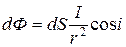 Тілесний кут, під яким видна площа з місця розташування джерела – d W, тоді потік, який падає від джерела світла на поверхню dS дорівнює: ,