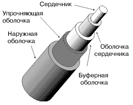 Волоконно-оптический кабель с плотным буфером В конструкции с плотным буфером (см. рис.8.2) защитный слой вокруг волокна в оболочке создается методом выдавливания пластмассы. Эта конструкция обладает значительно большей стойкостью к растяжениям, сжатиям и ударам, они допускают изгибы меньшего радиуса (но не менее 20 диаметров волокна). Прокладка такого кабеля осуществляется гораздо проще, и намного проще реализуются соединения. Эти кабели имеет малые диаметры и вес, они устойчивы к воздействию влаги и различных веществ и использование кабелей с плотным буфером.