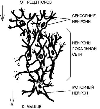 2. Структура простой рефлекторной нейронной сети. Выделяют несколько (обычно три) основных типов нейронных сетей, отличающихся структурой и назначением. Первый тип составляют иерархические сети, часто встречающиеся в сенсорных и двигательных путях. Информация в таких сетях передается в процессе последовательного перехода от одного уровня иерархии к другому.