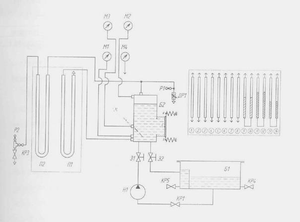 Б1 – питающий (регулирующий) бак с водомерным стеклом; Б2 – герметичный бак; Н1 – циркуляционный центробежный насос; КР1…КР5 – шаровые краны; Д1 – кран связи с атмосферой (дроссель); З1…З2 – клиновая задвижка; П1, П2 – пьезометры; М1, М2, М3, М4 – датчики давления
