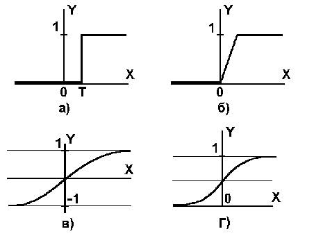 Рисунок 2. Схема элементарного нейрона. Нелинейная функция нейрона называется функцией активации нейрона, они бывают разных видов: скачок (рис.3а), линейная функция (рис. 3б), гиперболический тангенс (рис.3в), сигмоидальная функция (рис. 3г) и др.