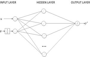 Рисунок 6. Схема прямого Рисунок 7. Схема инверсного нейроэмулятора нейроэмулятора Прямой нейроэмулятор имеет 1 скрытый слой с сигмоидальными функциями активации, на выходе имеет нейрон с линейной функцией активации. Он состоит из следующих входов: а) текущего управления u, подаваемого на канал вертикальной скорости с линиями задержки, их количество примерно соответствует порядку системы минус 1 б) вектор состояния канала вертикальной скорости вертолета S на предыдущем такте или наблюдаемая координата вектора состояния, с количеством линий задержек, примерно соответствующие порядку системы; выходом нейро-эмулятора является прогноз реакции канала вертикальной скорости вертолета А. Обратный нейроэмулятор Задача инверсного нейроэмулятора состоит в том, чтобы на основе текущей ошибки и знания предыдущего состояния вертолета, выдать корректирующее управление. Структура этой нейронной сети представлена на рисунке 7. Инверсный нейроэмулятор имеет 1 скрытый слой с сигмоидальными функциями активации, на выходе имеет нейрон с линейной функцией активации. Он состоит из двух входов: а) текущего отклонения реакций нейроэмулятора и вертолета с количеством линий задержек, примерно соответствующие порядку системы б) выход инверсного нейроэмулятора с количеством линий задержек, количество которых примерно соответствует порядку системы; выходом инверсного нейро-эмулятора является корректирующее управление.