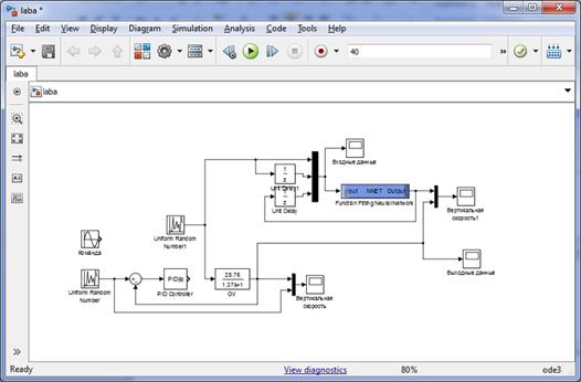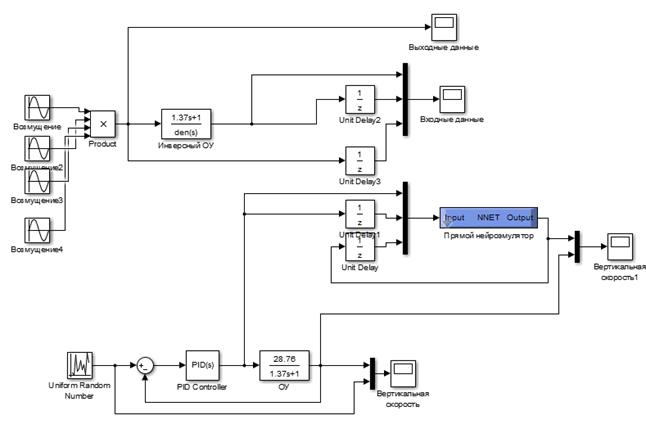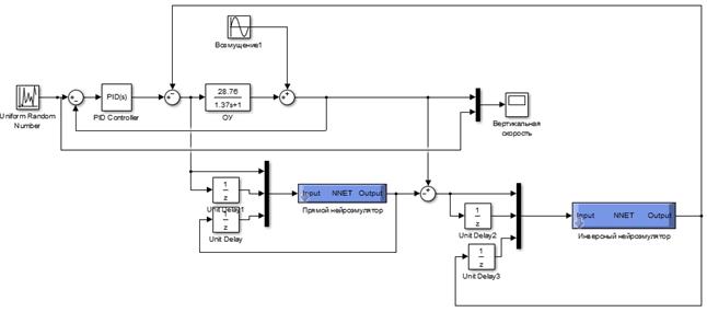Рисунок 15. Модель с прямым нейроэмулятором Проверим реакцию прямого нейроэмулятора на другой выборке, для этого изменим значение поля seed у блока uniform random number. Как можно видеть, реакция полностью совпадает (Рисунок 16).