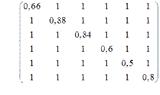 Следуя вышесказанному, составим задачу линейного программирования (почему без двойственной?): 0,66у1 + у2 + у3 + у4 + у5 + у6 ≥ 1 у1 + 0,88у2 + у3 + у4 + у5 + у6 ≥ 1 у1 + у2 + 0,84у3 + у4 + у5 + у6 ≥ 1 у1 + у2 + у3 +0,6 у4 + у5 + у6 ≥ 1 у1 + у2 + у3 + у4 +0,5 у5 + у6 ≥ 1 у1 + у2 + у3 + у4 + у5 +0,8 у6 ≥ 1 G= у1 + у2 + у3 + у4 + у5 + у6 → min у1= 0,11 у2= 0,32 у3= 0,24 у4= 0,09 у5= 0,07 у6= 0,19 v= 1/ (0,11 + 0,32 + 0,24 + 0,09 + 0,07 + 0,19)=0,98 p1= 0,11*0,98=0,108 p2= 0,32*0,98=0,313 p3= 0,24*0,98=0,235 p4= 0,09*0,98=0,088 p5= 0,07*0,98=0,068 p6= 0,19*0,98=0,186 Рекомендация - Гавайские острова. Доминирование стратегий Пусть i-я строка по элементно не меньше (≥) j-й строки, тогда говорят, что i-я строка доминирует над j-й строкой. Поэтому игроку А не выгодно пользоваться j-й чистой стратегией- ведь его выигрыш при i-й чистой стратегии не меньше, чем при j-й чистой стратегии вне зависимости от того, как играет В. Пример Упростить (редуцировать) платежную матрицу используя принцип доминирования: