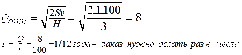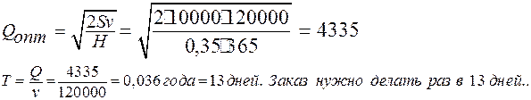 Пример. Потребность цеха сборки завода “ЗИЛ” в деталях составляет 120000 деталей в год. Хранение детали на складе стоит 0,35 у.е. в сутки, а поставка партии 10000 у.е. в год. Определить наиболее экономичный размер партии деталей (Q=?) и интервал между поставками. Имеем: Н= 0,35* 365, S= 10000, v = 120000.